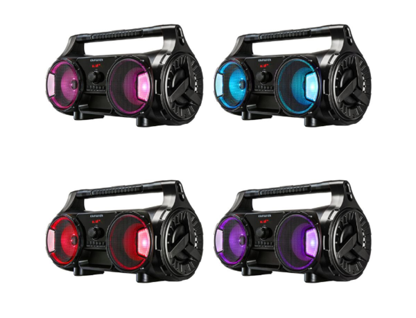Rechargeable^ Bluetooth wireless audio USB and microSD inputs* Colourful music-sensitive LED lights (can be turned off) Remote control LED display FM radio AUX input Microphone input* Carry handle