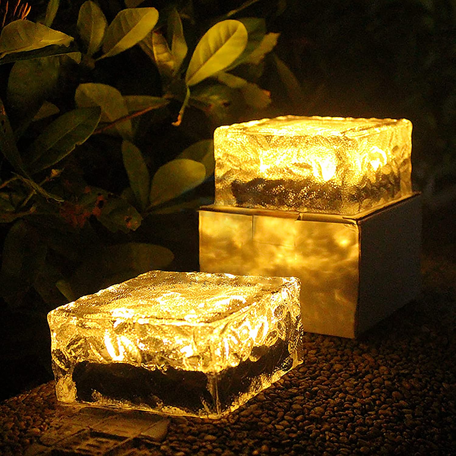 -Updated Design: A set of 2 frosted glass paths and garden solar light warm white, powerful 6 LED, the size of each light is: 3.9inch x3.9inchx2inch,it will be bigger than other ice brick light, so the scenery is more beautiful, the larger the lighting area, the better the visual effect